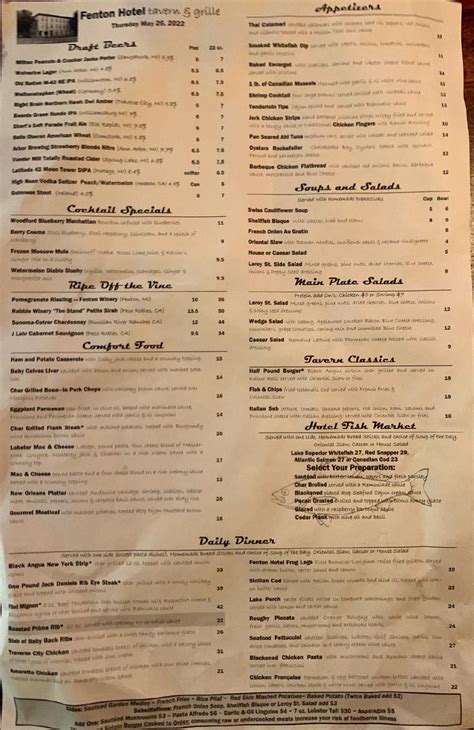 Web here at fenton hotel, in fenton we are passionate about making food that has substance to it, try our appetizing chicken. Web 302 n leroy st, fenton, mi 48430 historic establishment offering classic american fare such as prime rib, fish ’n’ chips & meatloaf. The menu, i believe, is printed out daily so the specials are already in the menu. Leroy st, fenton, mi 48430. A full food menu is available which includes amazing pizzas, scratch made appetizers, charcuterie, and delicious baked sandwiches. Web char broiled baby back ribs and gulf shrimp paired with twice baked. The prices are a little high but the portions make up for that. The fenton hotel tavern & grille stands solid and hospitable, greeting hungry patrons as it did when it was first built while the railroads came to fenton in. Not really sure about the other reviews, they seem to be describing someplace different than we saw, maybe new management? It features a daily menu with various delicious foods, including fresh fish, savory steaks, comfort food, and more.